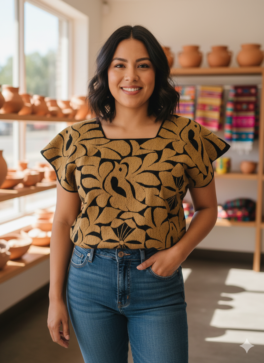 Blusa Artesanal Negra con Bordado Café – Pajaritos y Flores de Tuxtepec, Oaxaca