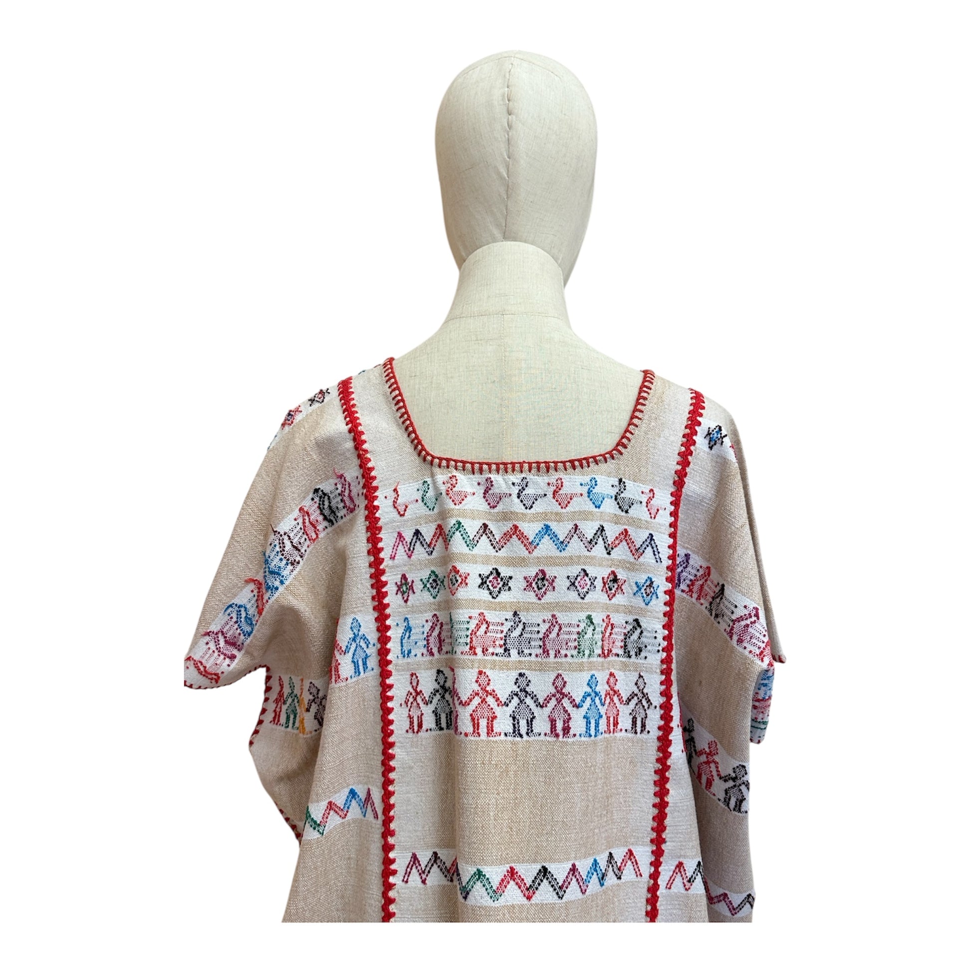 Este huipil está decorado con brocados tradicionales de patos, estrellas y flores, símbolos profundamente ligados a la cosmovisión y vida cotidiana de la región. Su tamaño lo hace ideal para quienes buscan una prenda amplia, con presencia, historia y elegancia discreta.