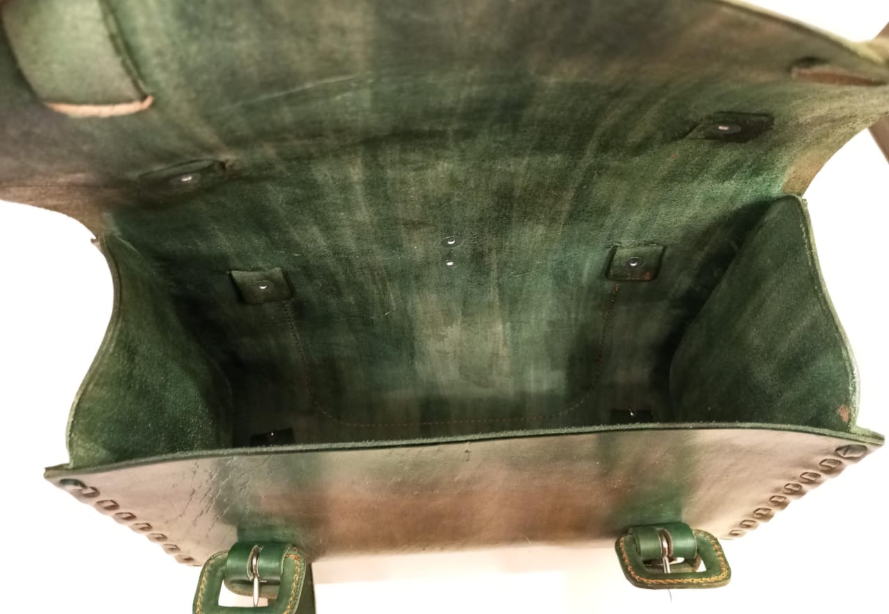 Destaca con nuestra Mochila escolar , una pieza única elaborada a mano en cuero genuino color verde bosque. Su forma compacta y tono vibrante la convierten en una declaración de estilo, perfecta para quienes aprecian el diseño artesanal con un toque robusto y aventurero.