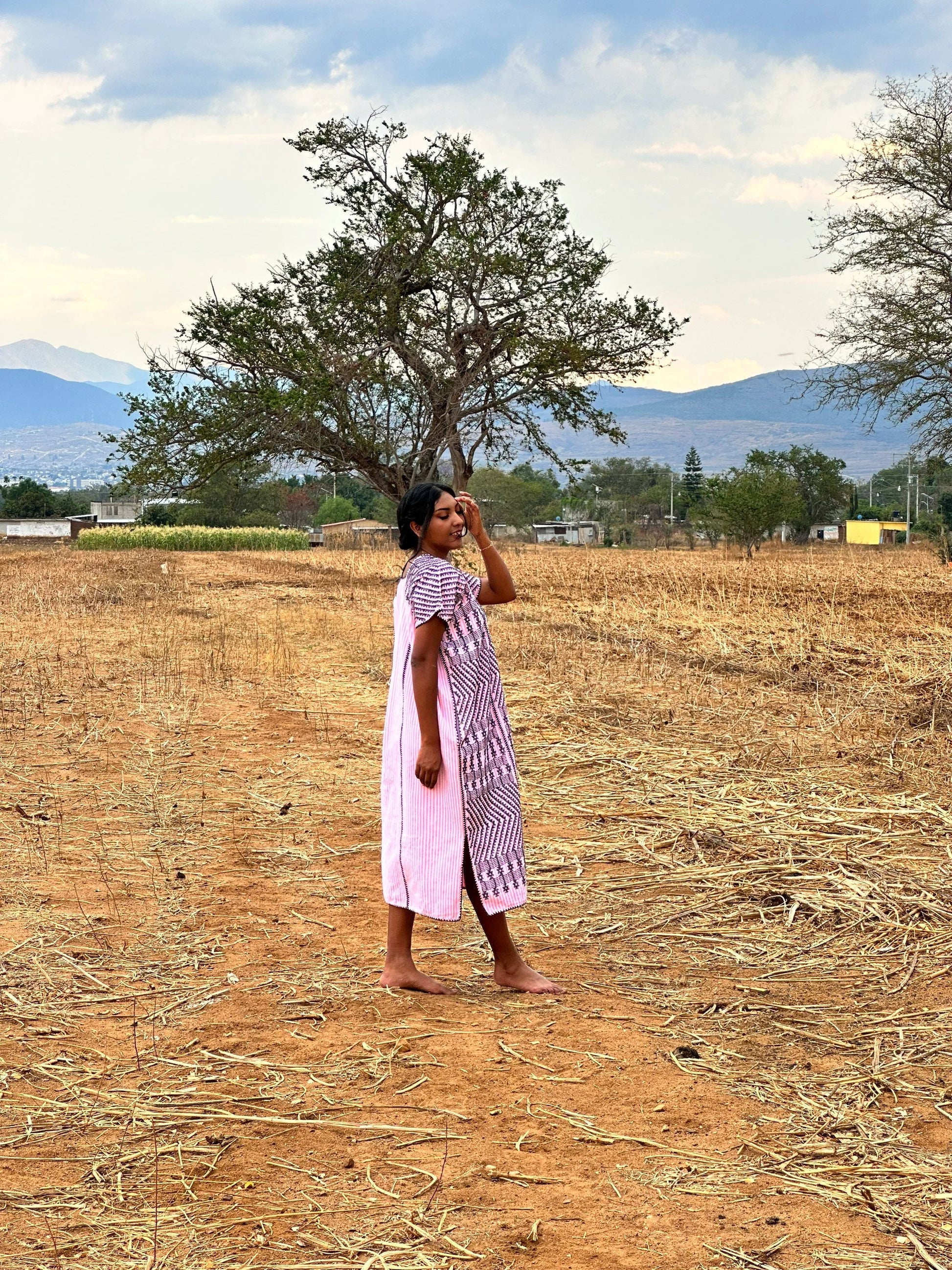 Diseño: Base rosa con rayas blancas; con una columna de brocado negro que cubre todo el huipil solo en la parte de enfrente, haciendolo aún más encantador que cualquier otro.