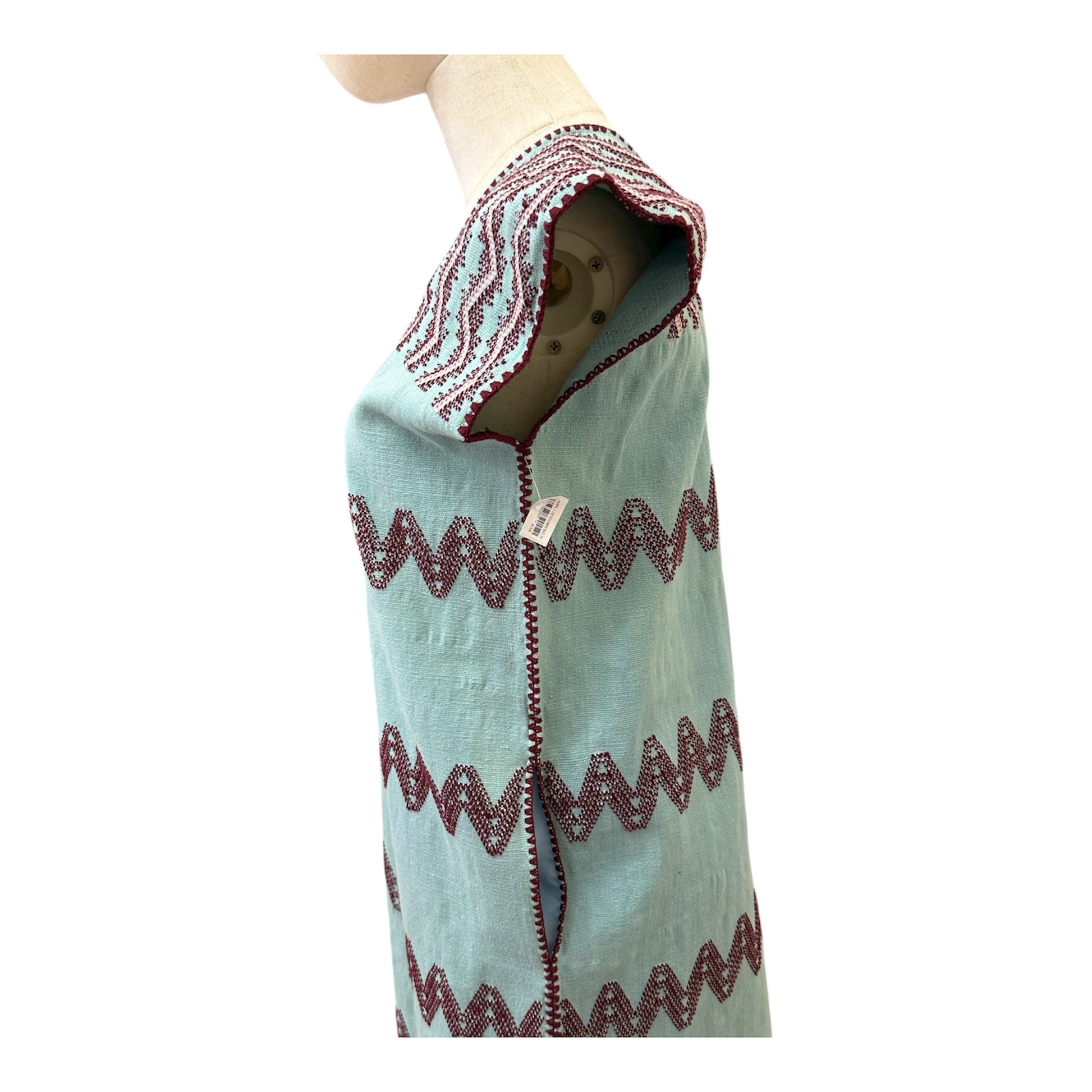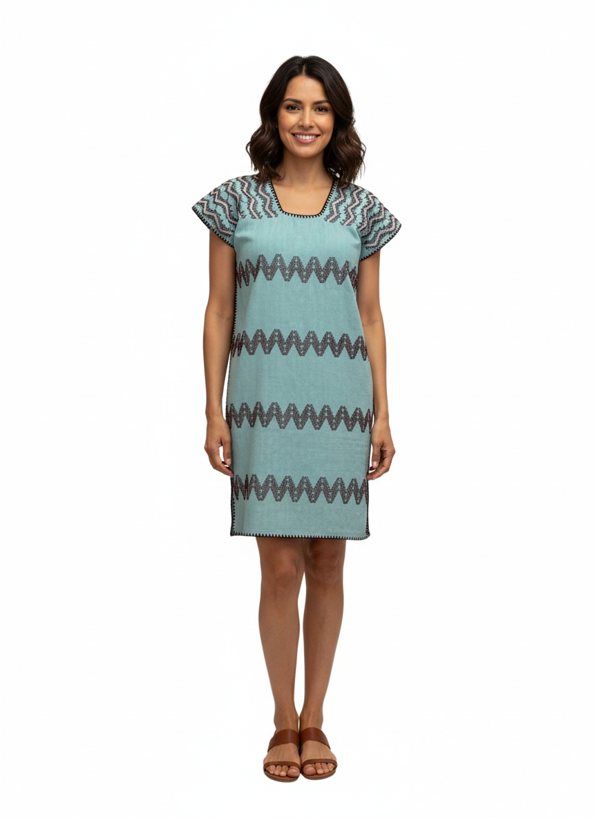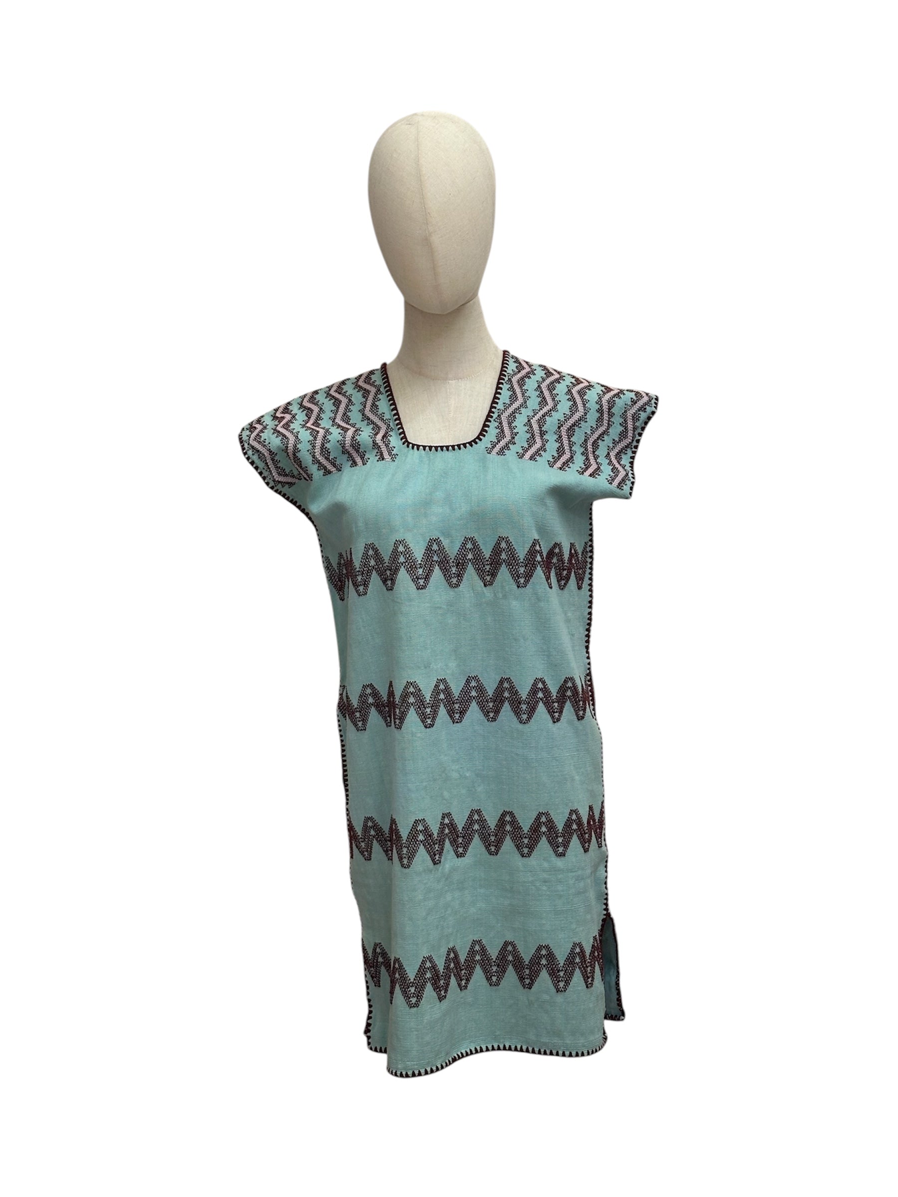 Este huipil corto color verde menta es una joya del arte textil oaxaqueño, elaborado en telar de cintura por artesanas de la región. Su diseño destaca por un elegante brocado en patrón zigzag mexicano, que resalta sobre el fondo menta y le da un carácter vibrante y único.