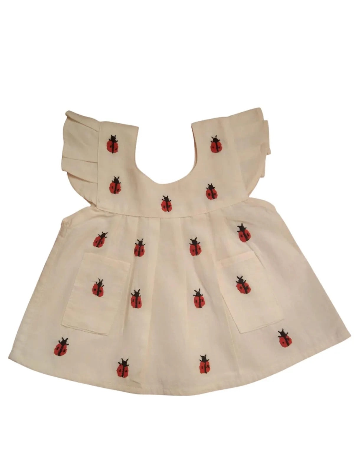 Vestido artesanal para bebé color beige con bordado de catarinas. Hecho a mano en Oaxaca con manta 100% prelavada. Fresco, cómodo, con bolsillos y tablillas.