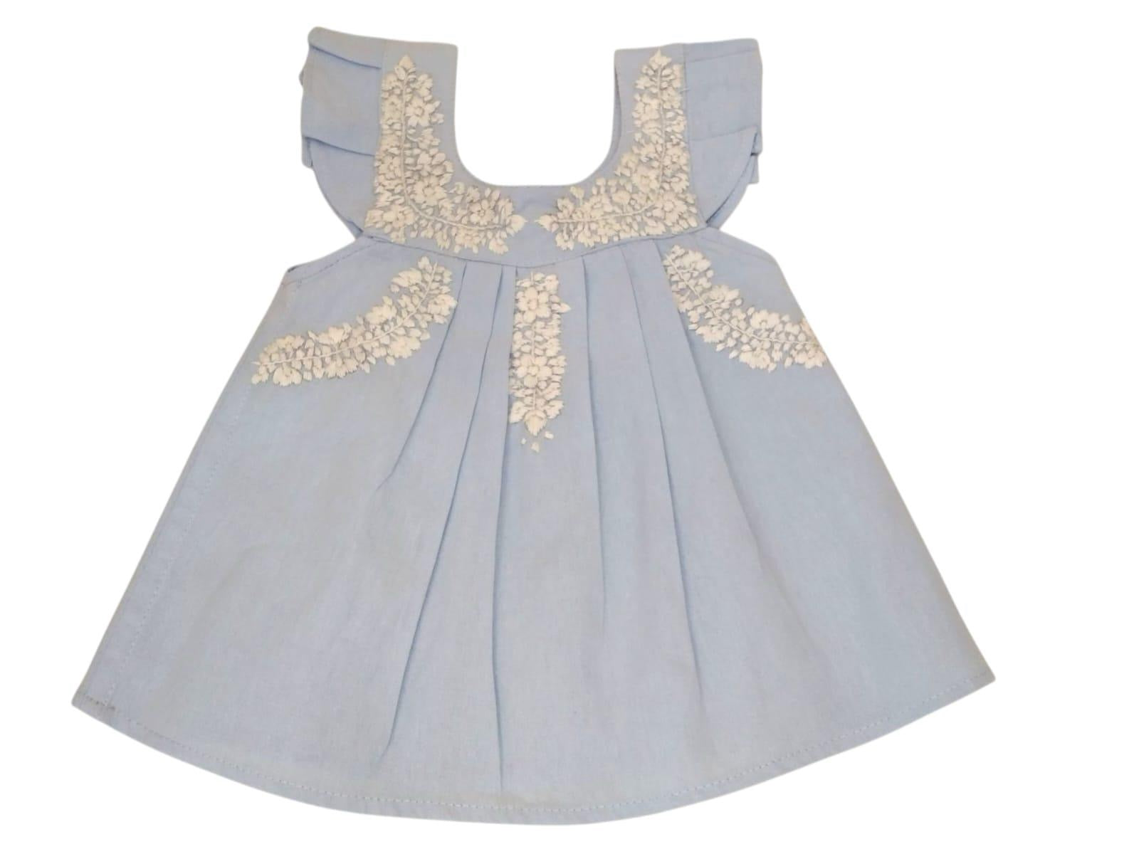 Vestido artesanal para bebé en color azul suave con olanes en las mangas y tablillas al frente. Hecho en Oaxaca con algodón 100% natural. Perfecto como regalo tierno y especial.
